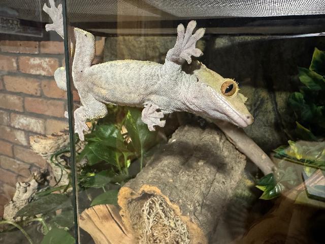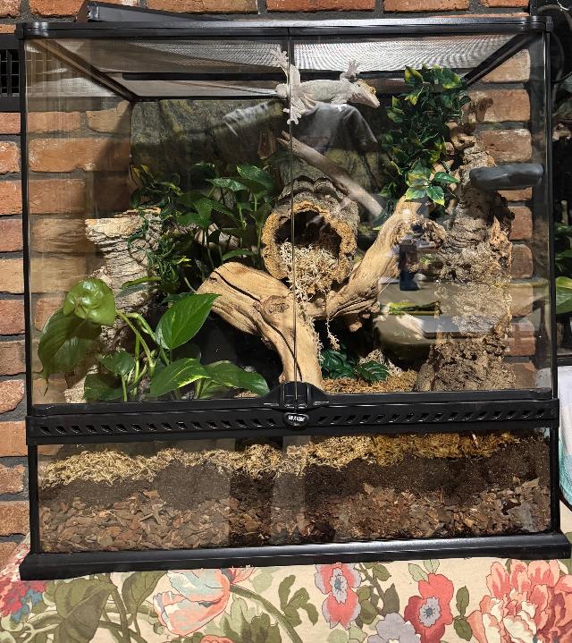 Billy Bob arrived a few weeks ago along with his fantastic habitat. He is eating paste food (Repashy, etc.) as well as small crickets from time to time. The adoption fee for this animal is $100 as his 24"L x 18"W x 24"H habitat in included. You will need to purchase a long tube Zoomed or Arcadia UVB light.